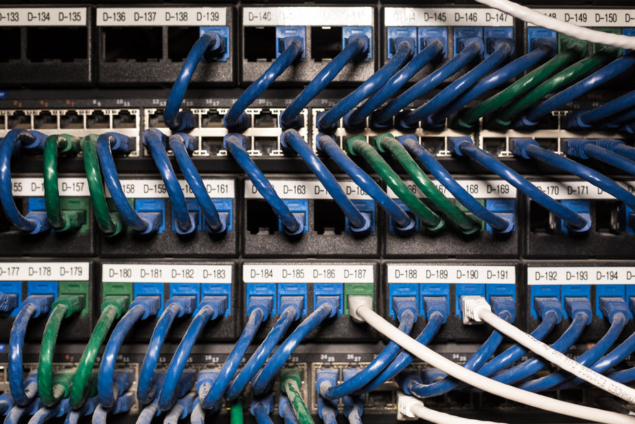 Um chip eletrônico amarelo e preto sobre uma superfície de padrão hexagonal azul e branca, rodeado de vários discos rígidos da mesma cor.