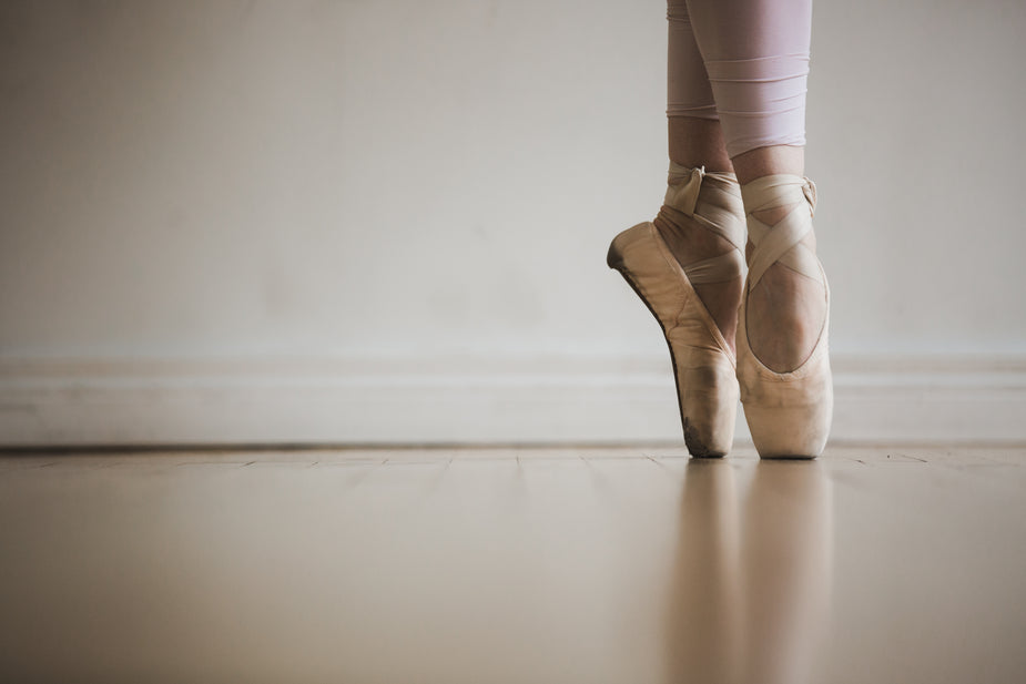 Uma bailarina moderna fotografada em pleno ar no meio de um salto com belas linhas retas nos braços e pés em ponta. Seu traje mostra suas tatuagens.