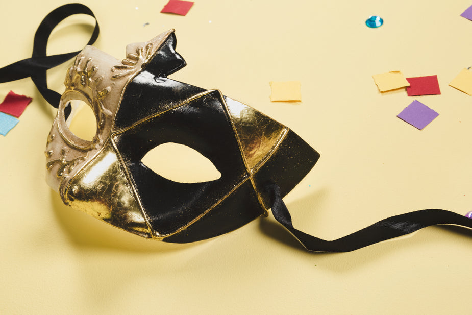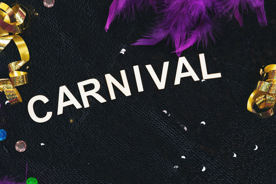 A sparkly background with sequins and feathers in black and purple with the Portuguese "CARNAVAL" written out on top.
