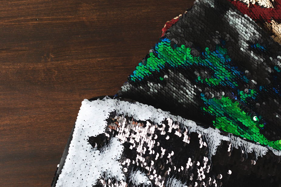 close-up view of a sequined item, half green sequins and, half black sequins.