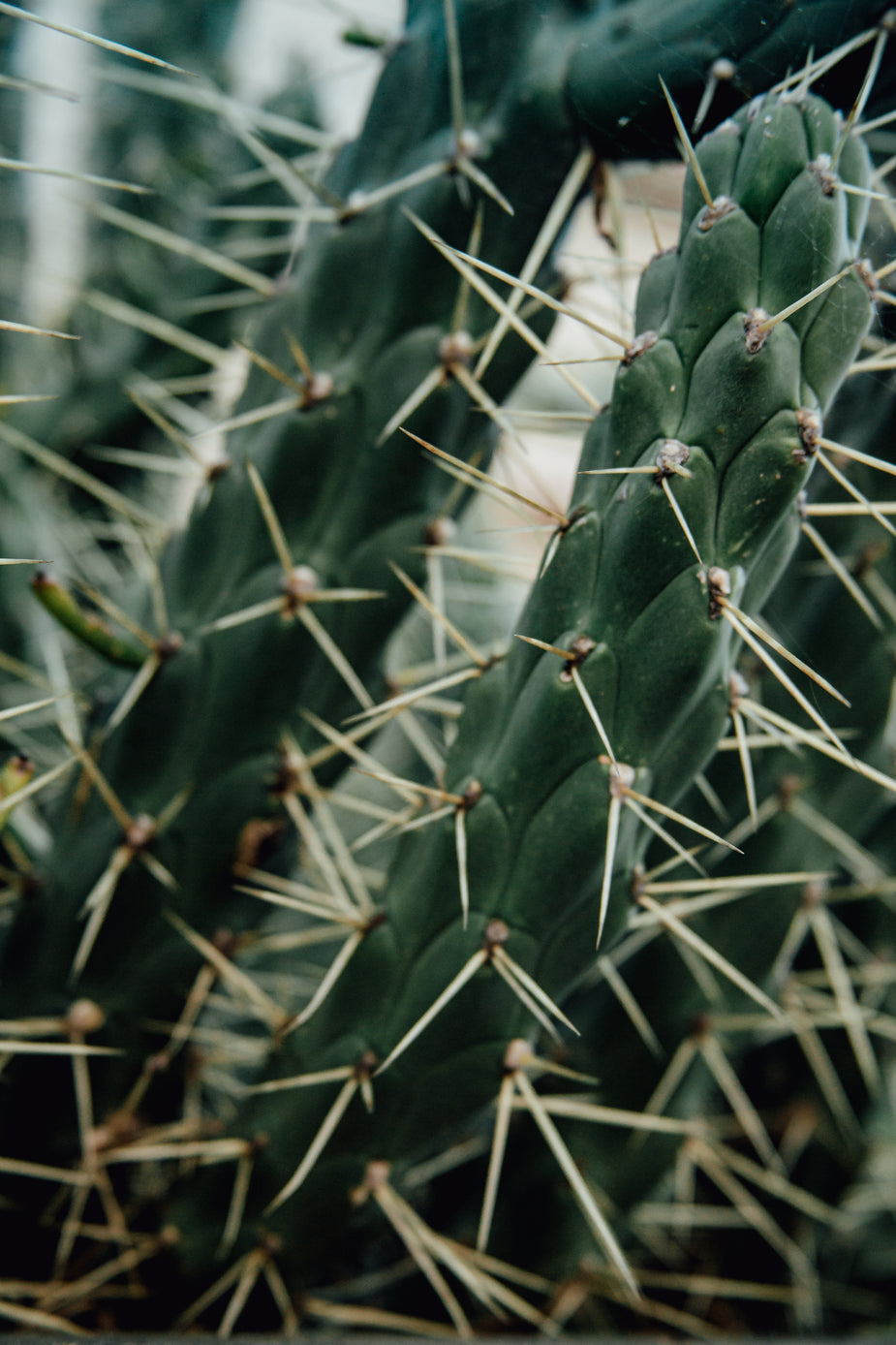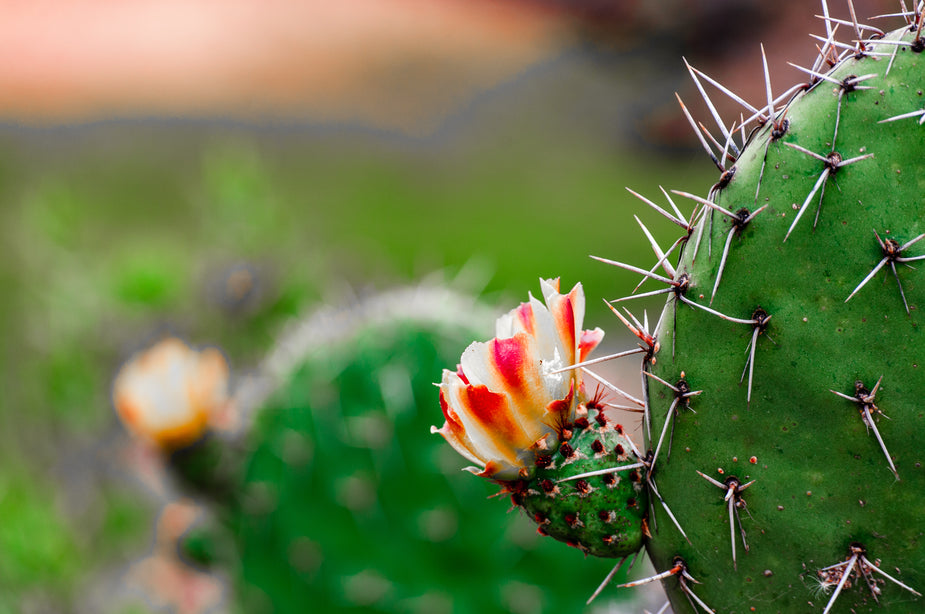 Three large round cactus plants sit on a leafy surface in a greenhouse.