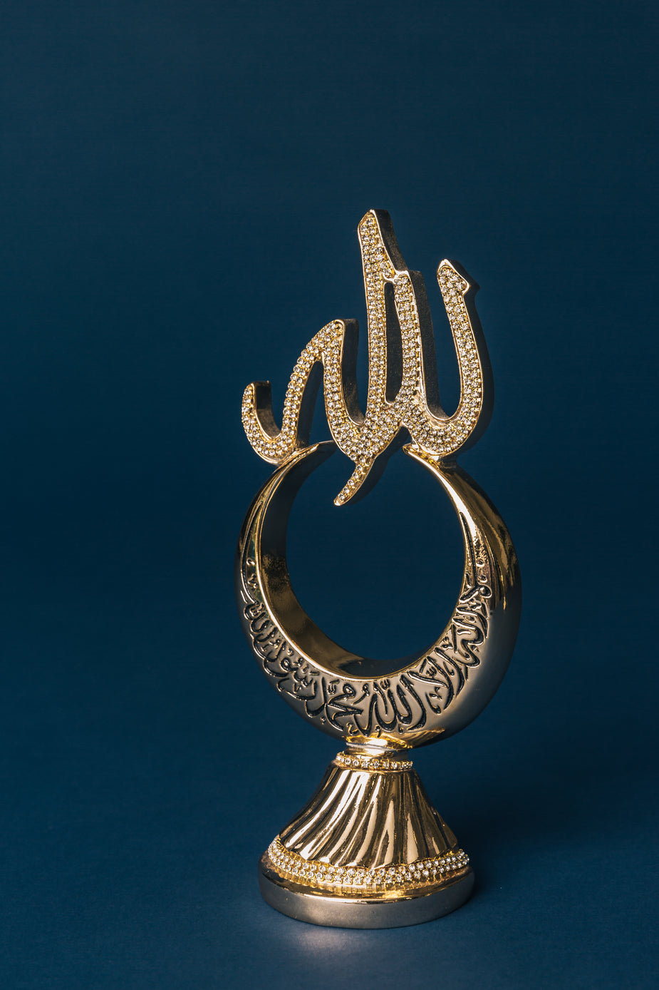 Gold with jewel details, this table decoration shows off the word Muhammad, the prophet of Islam.