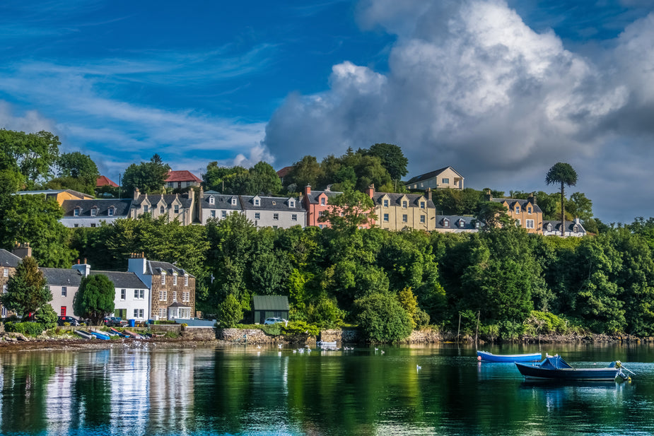 A rusty post sporting lamps, satellite dishes, and a microphone overlook a small village with rolling hills in the distance.