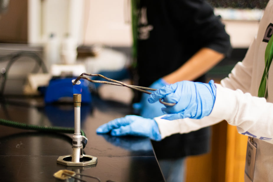 Freestanding turquoise blue containers hold several test tubes with orange lids. Colorful science gear!