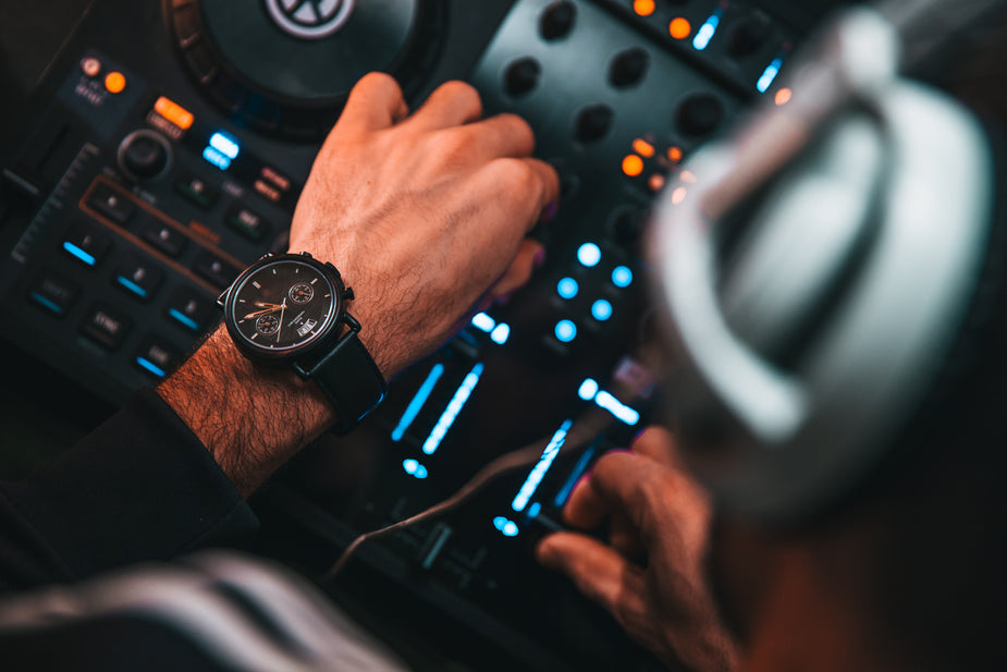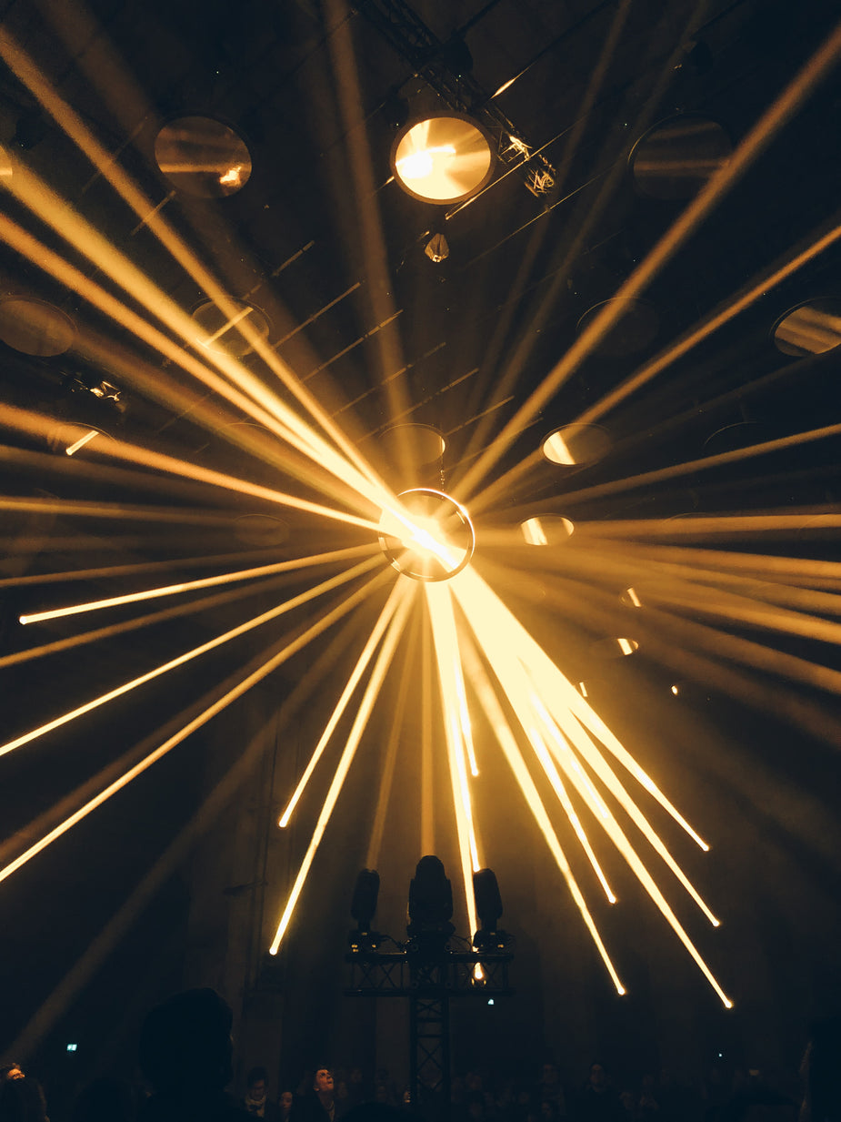 A sparkling disco ball reflects the bright blue spotlight into a dark nightclub.