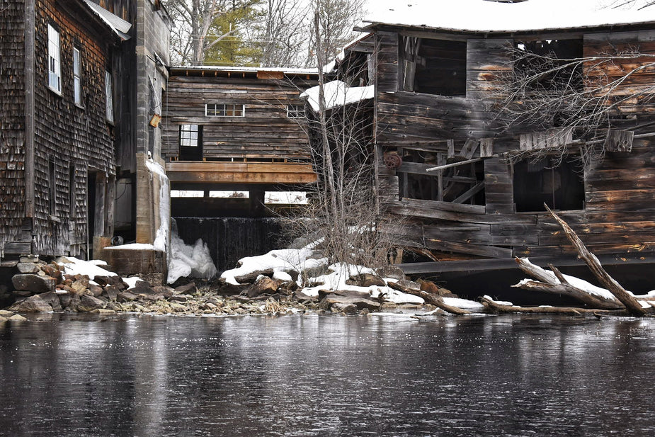 A group of a-frame houses in a quiet village, separated by patches of tilled land ready to be farmed.