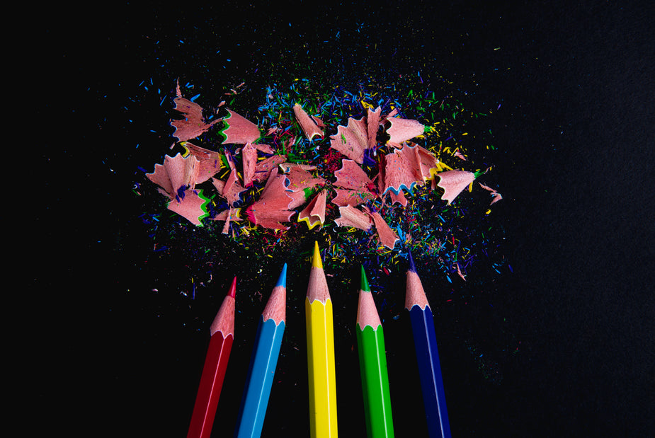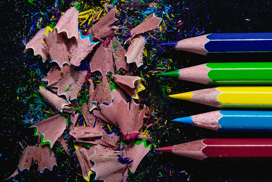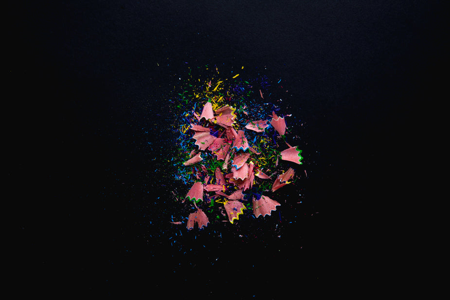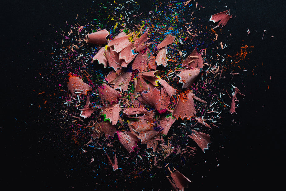 Two pencils, newly sharpened, lie in the shavings they've just shed. That's a sharp looking haircut!