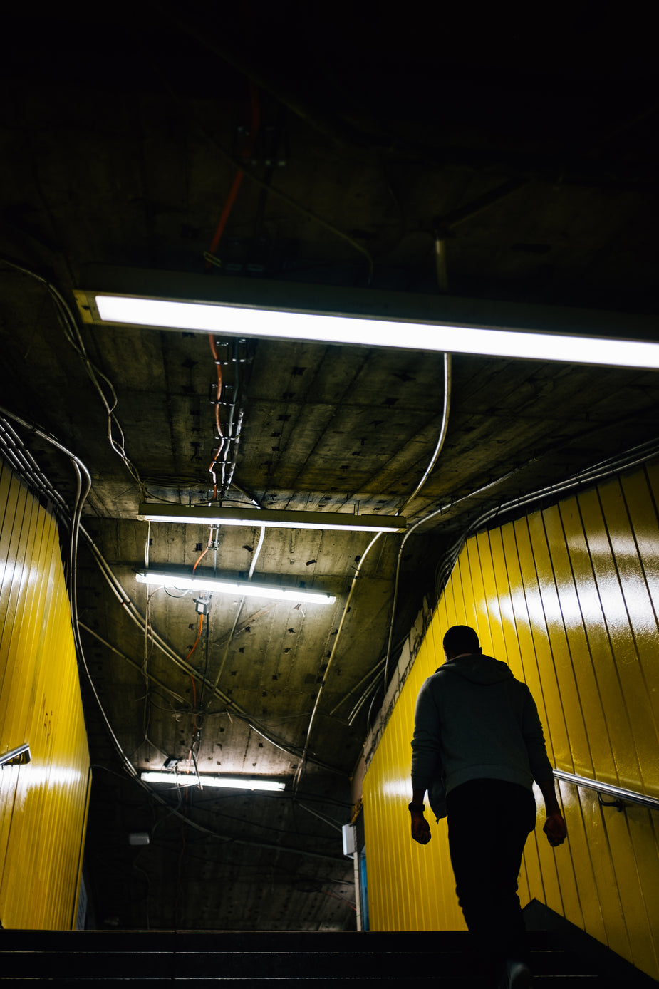 Neon lights illuminate this underground tunnel with automatic sidewalks. This will get you quickly to your destination.